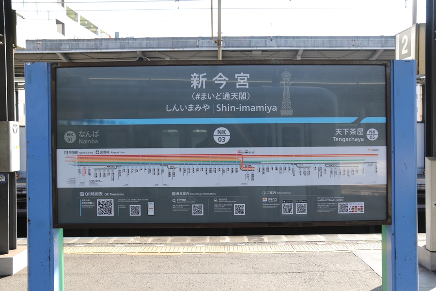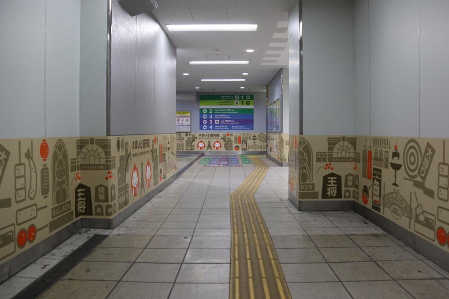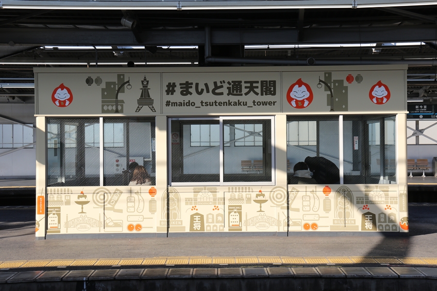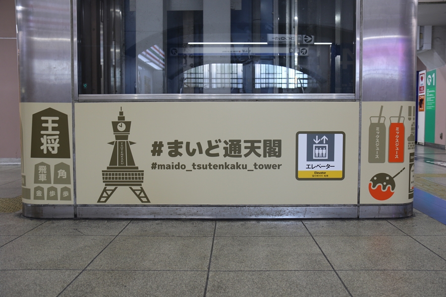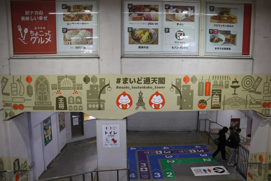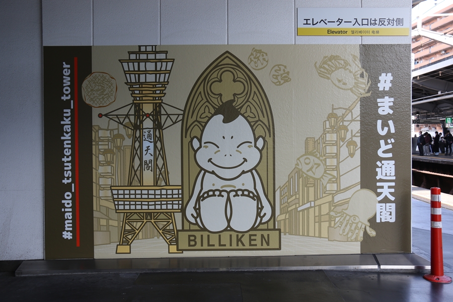 昨年12月4日(木)、新今宮駅に副駅名「#まいど通天閣(ハッシュタグまいどつうてんかく)」が導入され駅構内に「ビリケンだるま」による案内イラストが掲出されました。そこで私も新今宮駅構内を色々撮影してきました。まずは1階のイラスト。