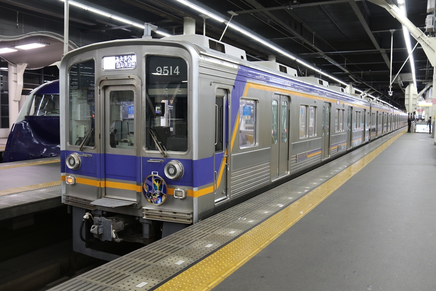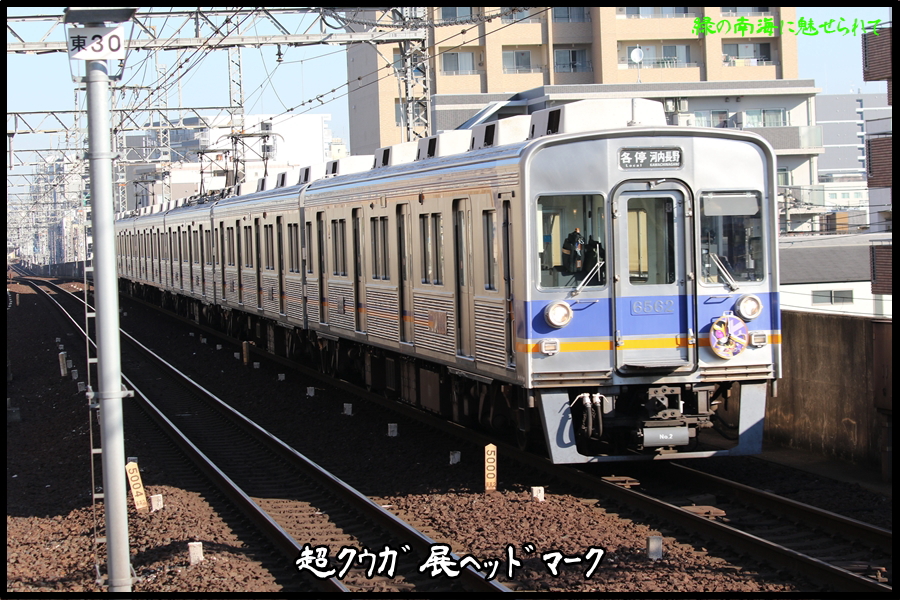昨年12月29日(月)から2月1日(日)まで南海線9513F、高野線6552Fに「超クウガ展」開催記念ヘッドマークが掲出されました。まずは大晦日の昨年12月31日(水)、前日に南海電鉄コールセンターで運用情報を得、難波駅にて6時22分から6時33分の停車時間に9513Fを撮影。